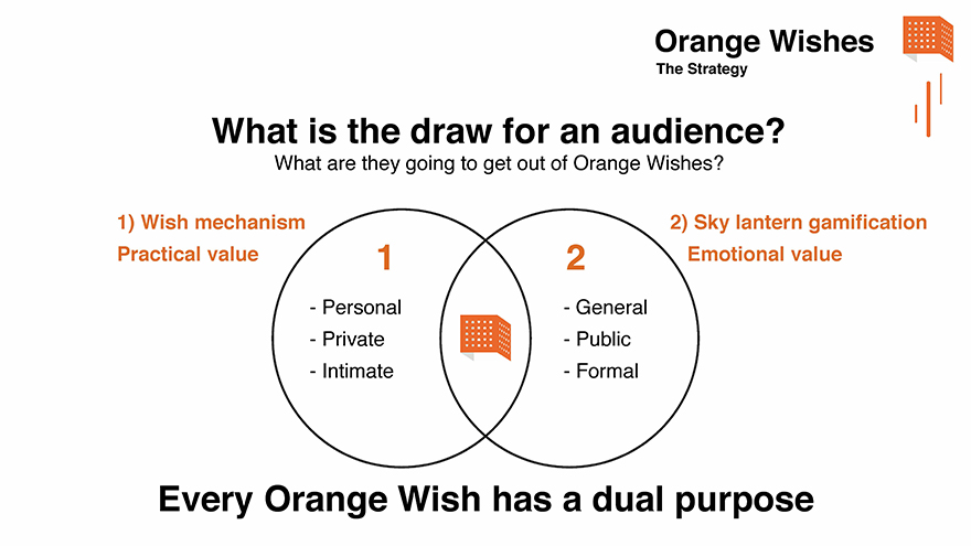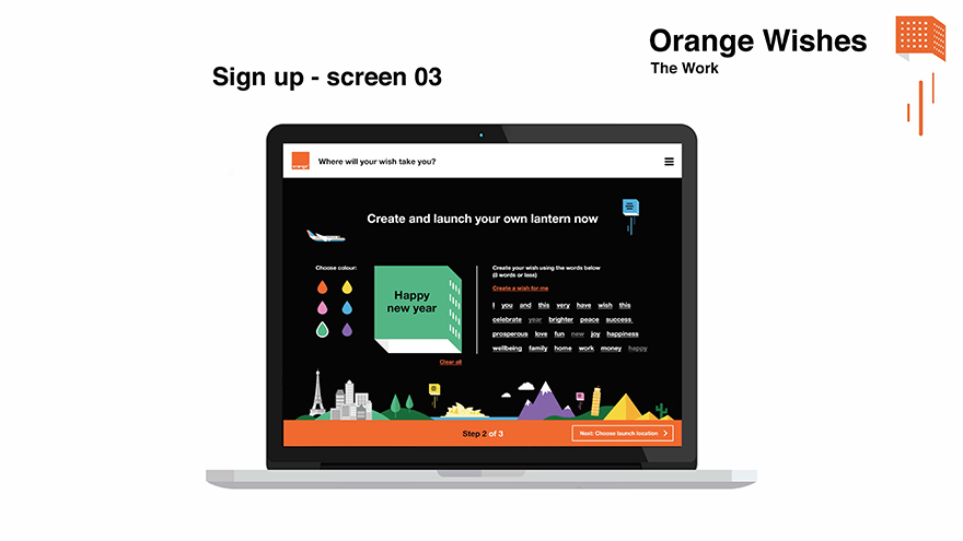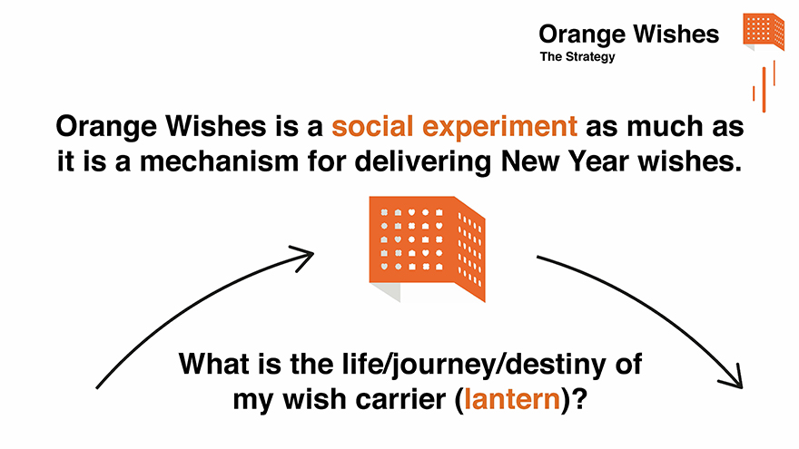 Orange Wishes - Case Study Challenge Every New Year Orange provides its employees and COMEX members with a greeting card to send to their corporate commercial contacts. This year the card needed to do more than just send New Year greetings from Orange, it needed to showcase a new strategic brand refresh called ‘Essentials 2020’ a new ethos of Listening and Responding. Ultimately showing what matters to people. Insight Orange were ramping up social media credentials with a Social Hub in Paris and every COMEX member had been given a Twitter account. We proposed a ‘phygital’ greeting card mechanic that began with a gift card, combining printed media with an online experience driven by social media so they could wish Happy New Year in a digitally innovative way. Solution An idea born of traditional Taiwanese sky lanterns, 'Orange Wishes' is a new and unique way to send Happy New Year wishes to other people using printed lanterns as cards enabled to fulfil in digital. Through a QR code, physical lanterns are transformed into digital lanterns that can be launched from anywhere on earth through a virtual online landscape experience. This digital lantern metaverse uses weather data from 24000 centres around the world to influence the lantern journey using a bespoke algorithm. The more likes each lantern gets on social media, the more fuel it receives and the further the lantern would fly.